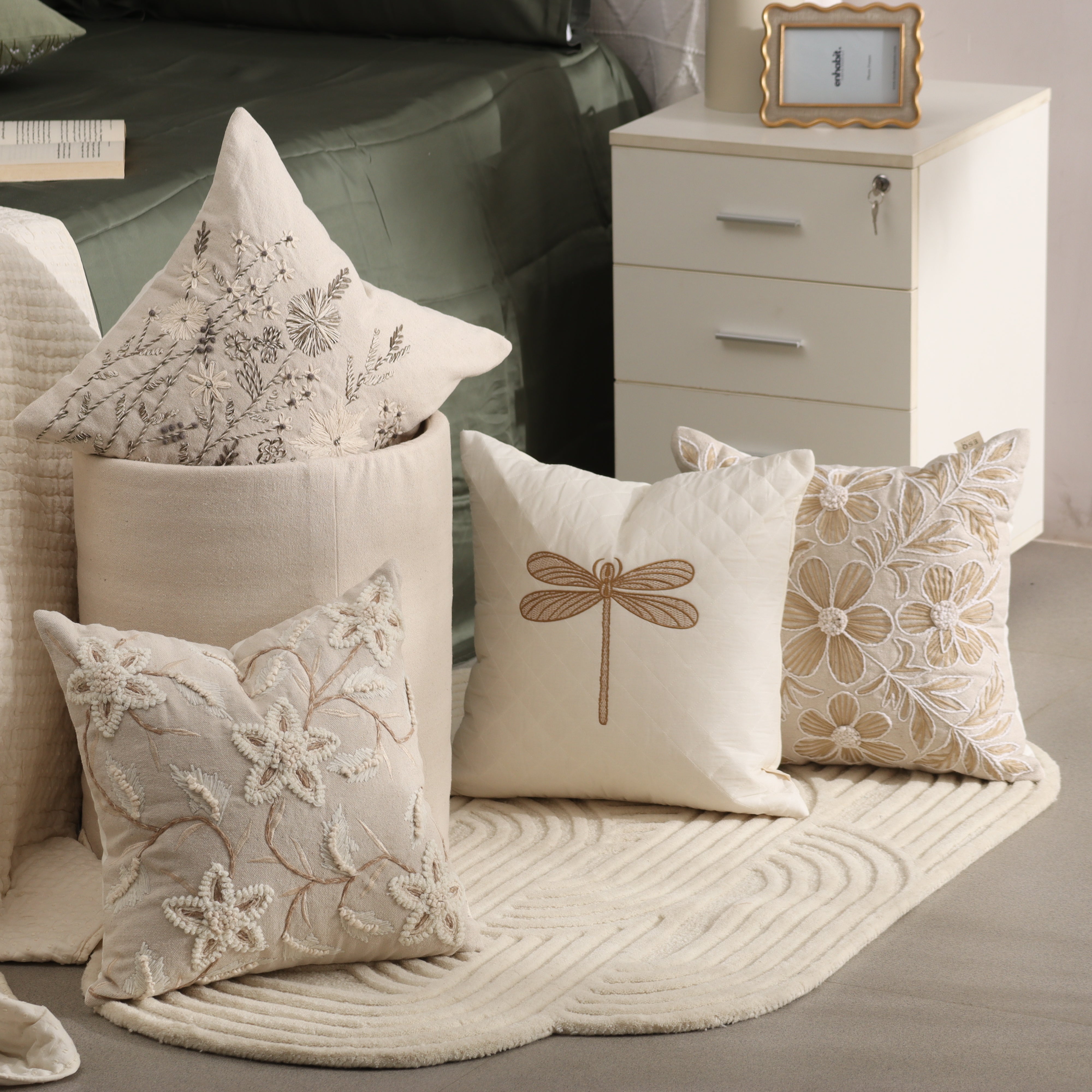 Dusk Meadow Embroidered Cushion Cover 45x45cm - Olive Beige