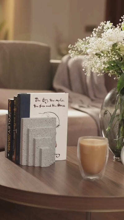 Create a beautiful display of your favorite books with these chic bookends! Crafted from concrete in an accordion shape, they’re very strong to hold multiple books with ease. They can be placed in two different ways to suit your needs. Their sleek black color and speckled texture makes them a stylish addition to any space.