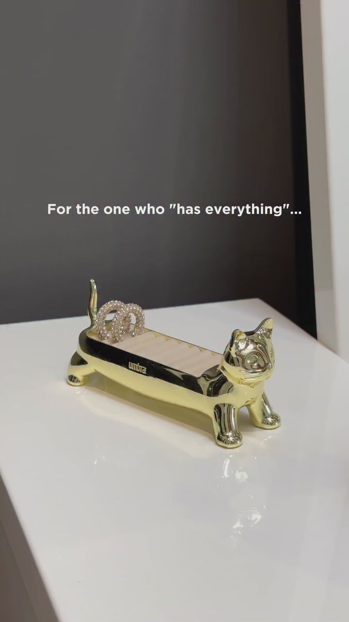 Bring a touch of playful elegance to your space with Ali Cat Ring Holder, a charming ring holder inspired by the lovable munchkin cat. Designed with velvet cushions to protect your rings, while adding character to your décor. Crafted from heavy cast metal with a hand-polished chrome finish, this ring holder has its own unique character and shine. Whether placed on a nightstand or vanity, it serves as both a whimsical accent and a thoughtful gift for a jewellery lover.
