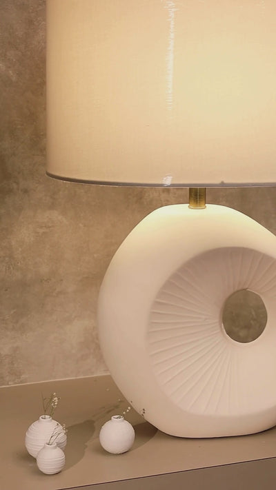 Enhance the beauty of your home with this gorgeous table lamp! Crafted from high-quality ceramic, it has a seashell inspired ovoid shape. The center of the lamp features a concave depression leading to a hollow circle to create a modern visual depth. This concave area is further decorated with engraved lines that highlight its depth in a subtle way.
