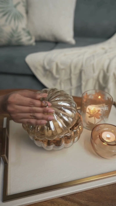 Keep your essentials organised in style with this lovely storage jar! Crafted from high-quality glass it is shaped like a pumpkin with details like sections and the stem expertly sculpted into the form. The stem in the center of the lid acts as a knob to open the jar easily. It has an elegant translucent honey gold hue that allows it to match any space effortlessly.