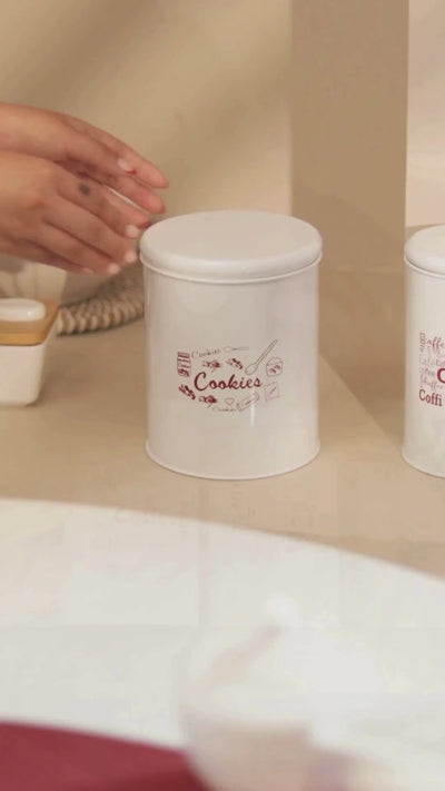 Featuring a cheerful white color, this jar has a red print in the front that says 'Cookies' surrounded by art of different sweet treats. This cookie jar's versatile size makes it great for keeping it on the countertop or storing it away in a cabinet, as per your preference. Match it with others in the same style for a delightful kitchen update!