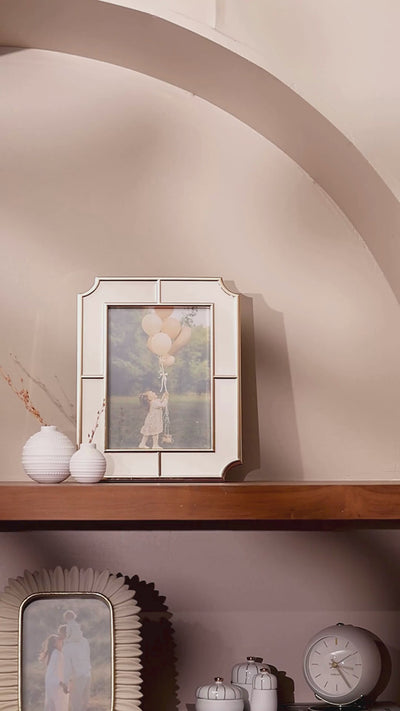 Display your memorable moments in style with this delightful photo frame! Crafted from metal, it has a unique notched style that is inspired from traditional French masonry. The wide frame is colored in white with gold borders around the edges and gold mid-lines on each side.