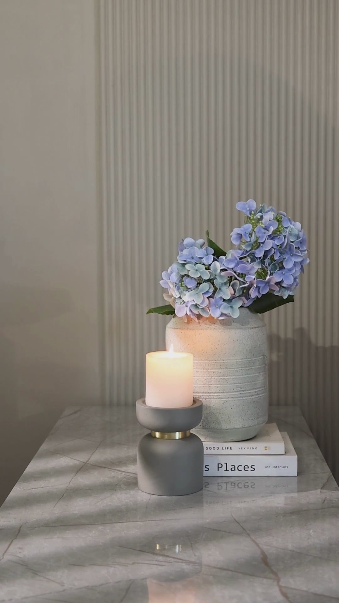This candle-holder has a large flat bed with a subtle groove to keep the wax from dripping out. A column candle continues its modern shape, but you can add your own twist to it with a tealight for a subtler look or some taper candles for a more ornate look. Pair it with others in the series to create a matching tableau for your next get-together!