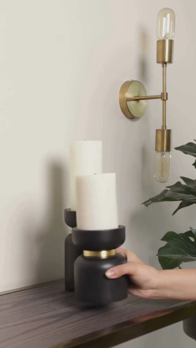 Inspired by the simplicity and elegance of Bauhaus design, this candle-stand is a chic addition to any space! Crafted from concrete with a smooth matte black finish, it has a distinct modern yet retro vibe that echoes the inspiration perfectly. The clean cylindrical shape is accented by a golden ring that seems to contract the shape to form a natural handhold.