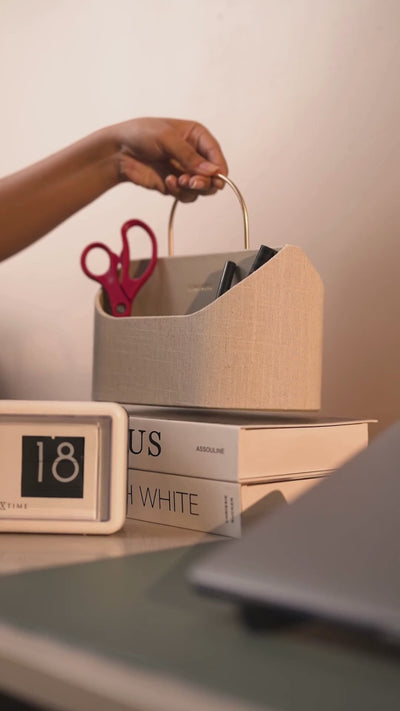 Keep your essentials stylishly organised with the Desk Organiser Caddy, a versatile storage solution for any space. Crafted from a sophisticated mix of oatmeal PU and linen, this portable caddy features multiple compartments to neatly separate and organise your stationery essentials. This desk caddy offers ample space while remaining compact enough to fit comfortably on your desk or shelf. Its versatile design ensures that it’s not just practical but also a stylish accessory.