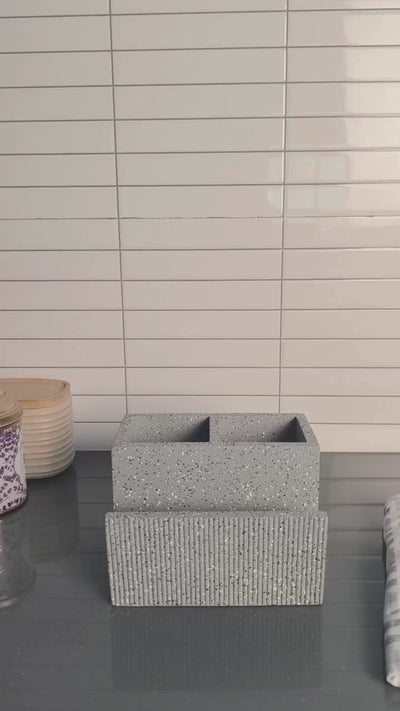 A versatile combination to keep your table neat and organised! This combo holder has two roomy slots for your cutlery and an elongated holder on the side for napkins. Crafted entirely from concrete, it has a reassuring heft that will prevent toppling and the speckled grey look adds a modern touch to this classic table essential.