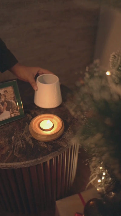 The Embossed Lantern- Forest in white with a wooden base is a cute addition to any space. If a tealight is lit inside, a yellowish glow comes through the white porcelain walls and the top, illuminating the lantern sculpture. It has a wooden base at the bottom which can be used to put the tealight. The lantern itself can be lifted from the base for easy removal of the tealight.