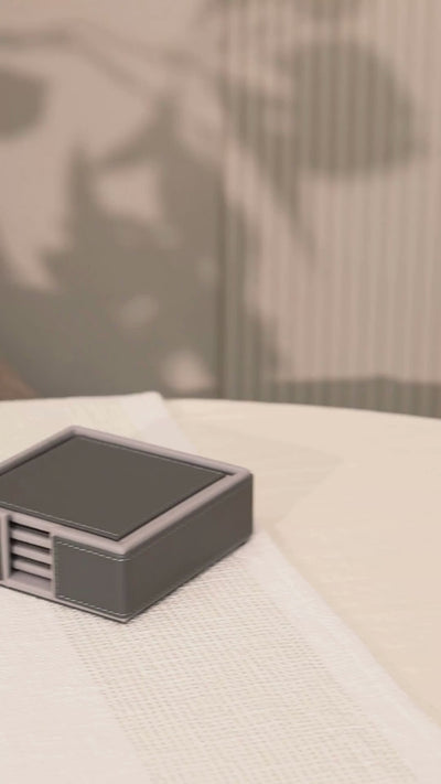 Featuring a square shape, the coasters and holder are colored in dark-grey with highlights of a lighter grey to give them a contemporary elegance. Perfect for your dining table or bar counter, this set of four coasters is also an excellent addition to your cabin desk!