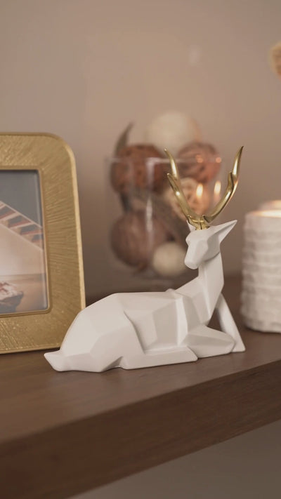 The Faceted Sitting Antler Decorative Sculpture in elegant white is an eye-catching piece with a sleek white faceted body and striking golden horns. With a gentle tilt of the head, this sculpture exudes a sense of grace. A perfect addition that effortlessly captures attention and admiration. The decorative accent can be placed on a table, bookshelf, or mantel.