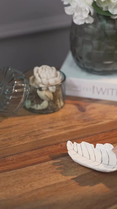 Keep your daily essentials on-hand with this elegant trinket dish! Crafted from ceramic, it has been shaped to resemble the beautiful gingko leaf. The interior of the dish also has delicate detailing to recall leaf veins to complete the look.