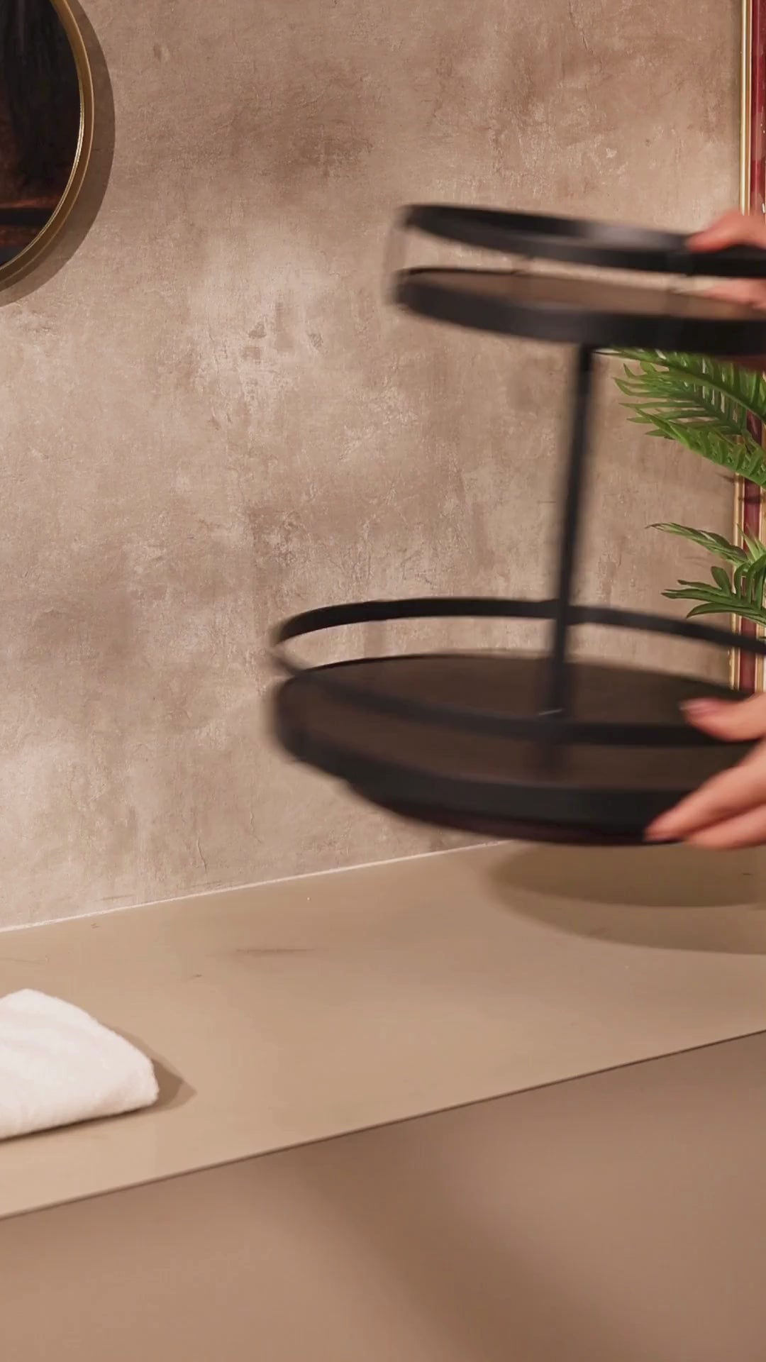 Make your essentials easy to reach with this chic turntable organiser! Consisting of two tiers, the base of this organiser turns 360* making it easy to find the items you need. The frame of the organiser is made from black-hued metal while the trays have a base of dark-brown varnished wood for a chic modern contrast.