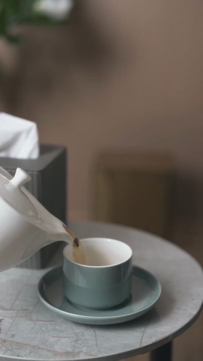 Make an elegant addition to your tableware collection with this cup and saucer set! Crafted from high-quality ceramic, it has a slate grey color. Shaped in a geometric style, it has a minimal and modern look.
