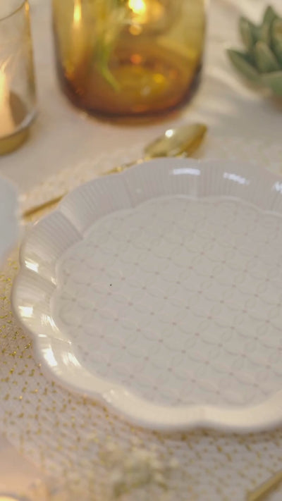 This plate mimics the look of a flower with a curved edge like petals, that are raised up. A quatrefoil pattern on the inside of the plate highlights the floral inspiration & adds a sweet detail to the overall look.