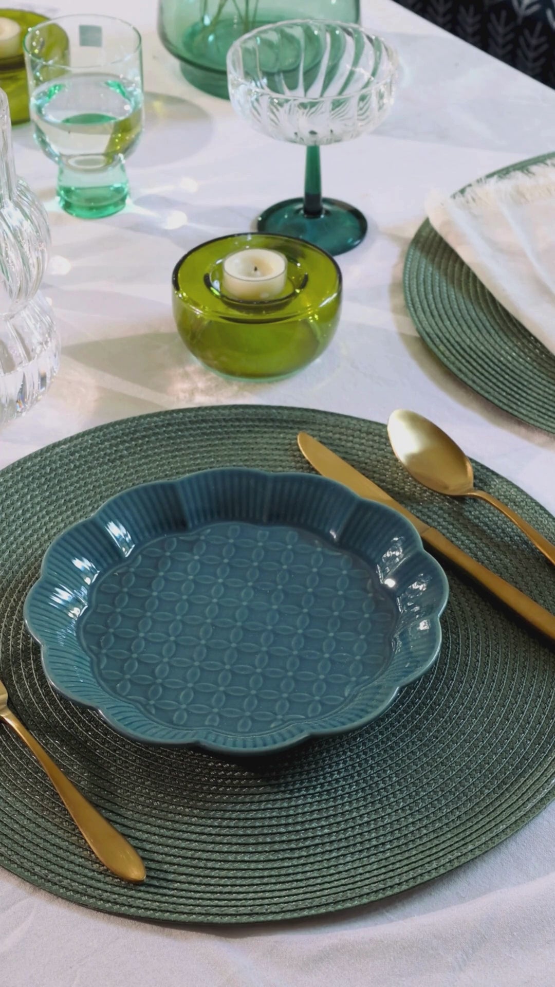 This plate mimics the look of a flower with a curved edge like petals, that are raised up. A quatrefoil pattern on the inside of the plate highlights the floral inspiration & adds a sweet detail to the overall look.