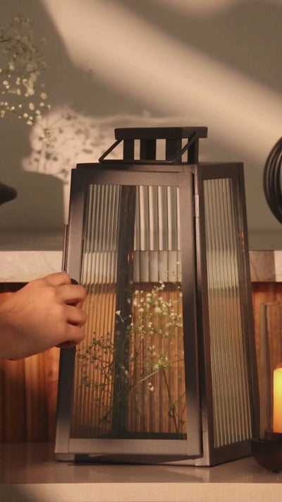 One side of the lantern is hinged and closed with a clasp, allowing you to house both large column candles or small tealights inside. It also has foam pads at the bottom to protect your surfaces and a clever opening on top to prevent soot. The fluted glass on three sides creates lovely refractions of the light, elevating the look even more!