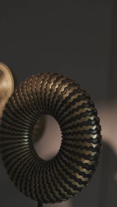 The circular sculpture features a modernist design with wavy lines of black debossed onto the gold base. Hollowed in the middle, it perfectly balances its look to be eye-catching with an airy style. Great for your home or office, this abstract sculpture also makes for a chic gift to friends and loved ones!