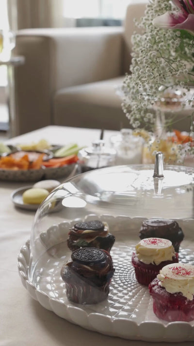 This Tiffany Cake Serving Tray is a great way of serving cakes, pastries and other goodies to your guests! The gorgeous white base flaunts the distinctive Tiffany relief chequered pattern, also making for a great resting place for fruits or desserts. The dome on top keeps the inside contents fresh and safe.