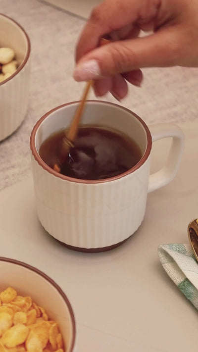 Make mornings more stylish with this exquisite mug! Crafted from ceramic, it has a modern style with a fluted exterior. Featuring a cream-colored base it has a brown-hued band at the base and rim for a charming contrast.