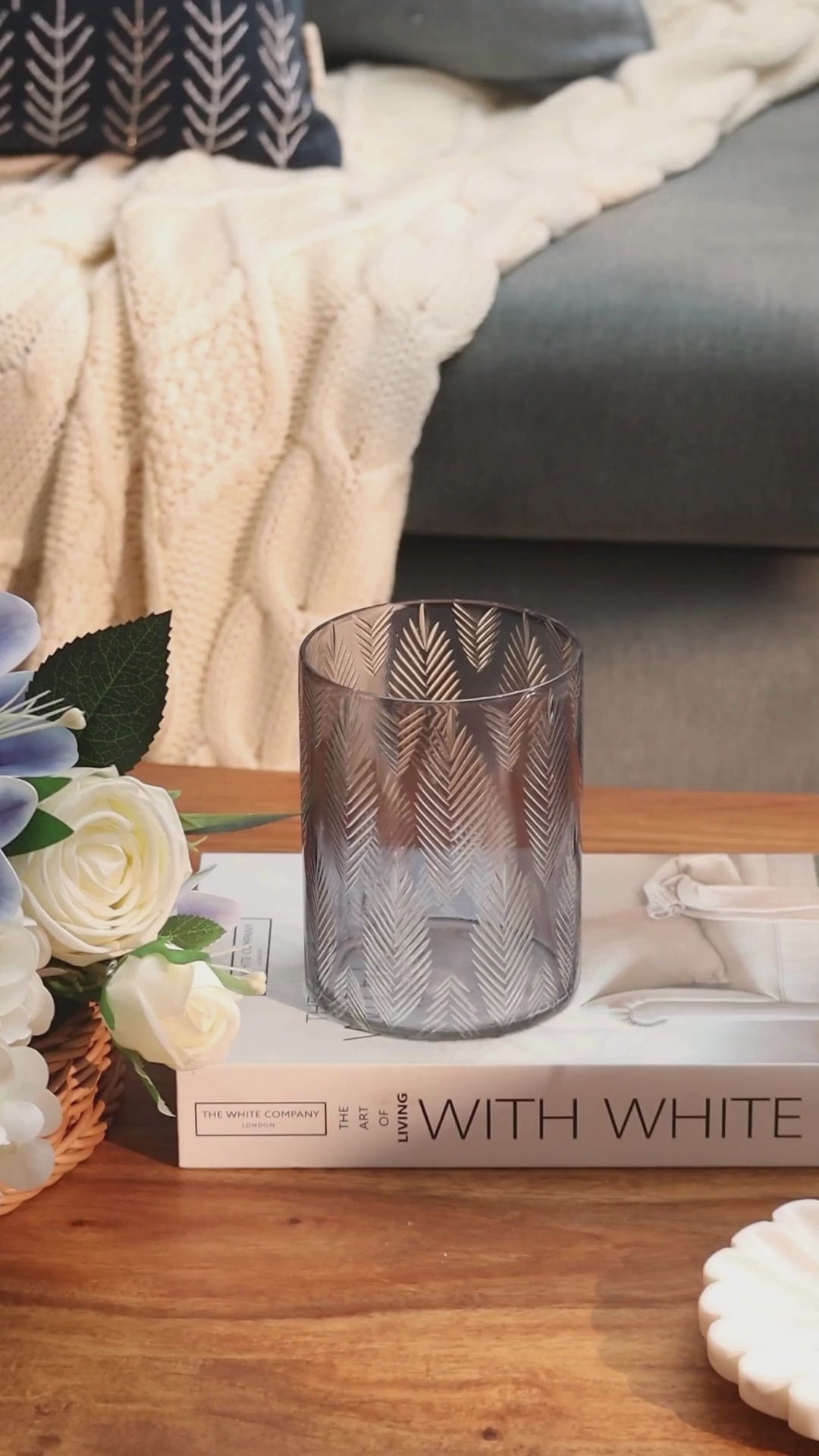 Gift your loved ones in contemporary style with this chic hurricane gift set! The two hurricanes are crafted from high-quality glass, featuring a delightful etched design of areca palm leaves in a minimal style. While the hurricanes themselves are colored in smoke-grey, the etched design is clear to create beautiful patterns when lit from within.